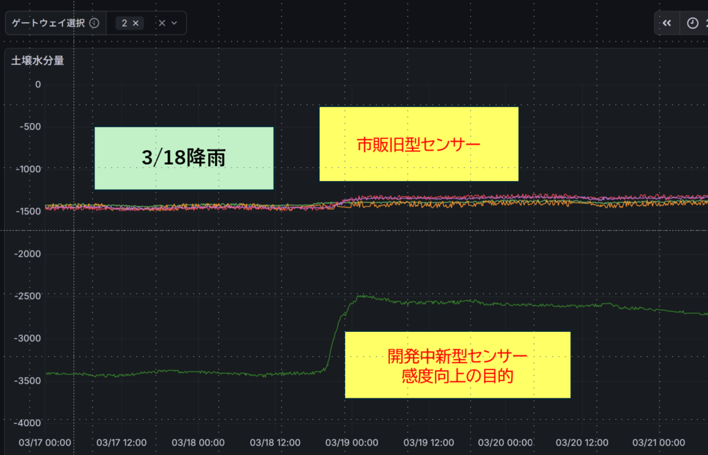 土壌水分量の測定は、最も難しい項目の一つです。電子回路、電子デバイスの経験を活かし、新しくセンサーを開発しました。