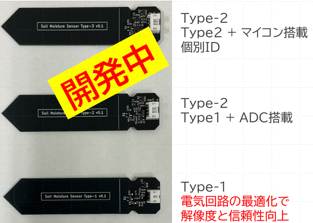従来の土壌水分量センサーと比較して、測定精度と信頼性を大幅に向上しました。さらにアナログ・ディジタル変換器付き、位置情報、個体情報を記憶するマイコン搭載等開発中です。